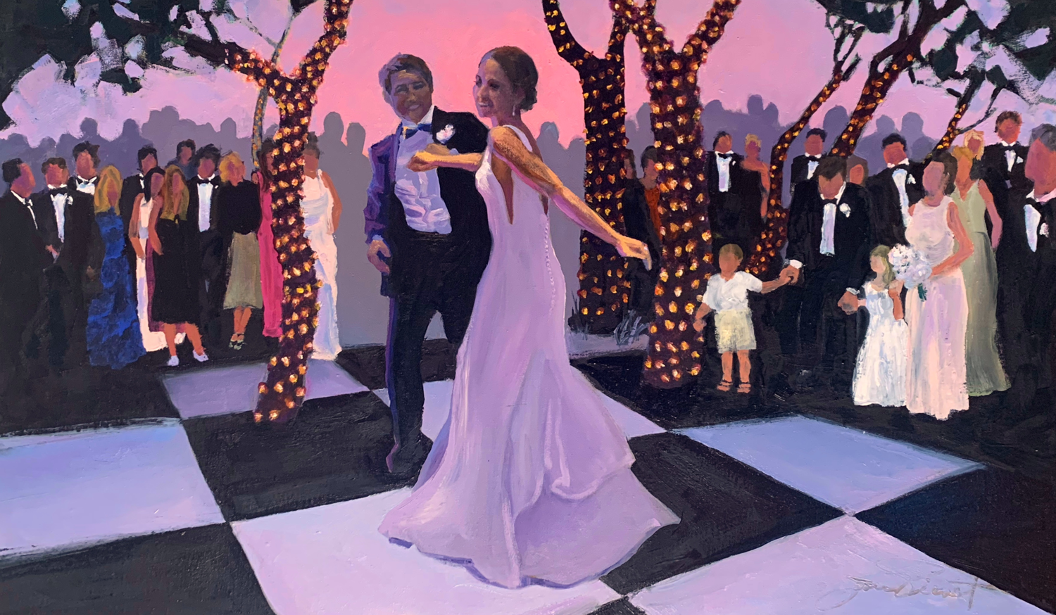 The event coordinator usually has me set up off to one side where people can see my work as it progresses, yet where I will not be in the way of the festivities. Additionally, I use oil paint with completely odorless materials so that there is no obtrusive scent. I generally start painting the scene an hour or so before the event begins. As a result, groundwork has been laid by the time the scene of your choosing happens. Oftentimes, this scene is the first dance, the presentation of the couple, a speech, or a specific memorable moment. However, if you do not have a specific moment in mind, I will capture the essence of the event rather than focusing on one moment.